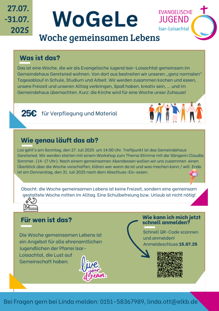 Die Jugendgruppe 2024/2025 trifft sich alle 2 Wochen am Mittwoch in Wolfratshausen. Sie findet von 17-19 Uhr statt und wird von regionalen Teamer*innen geleitet. Für weitere Infos an Linda Ott, Mario Erl oder Anna-Maria Schindele wenden.